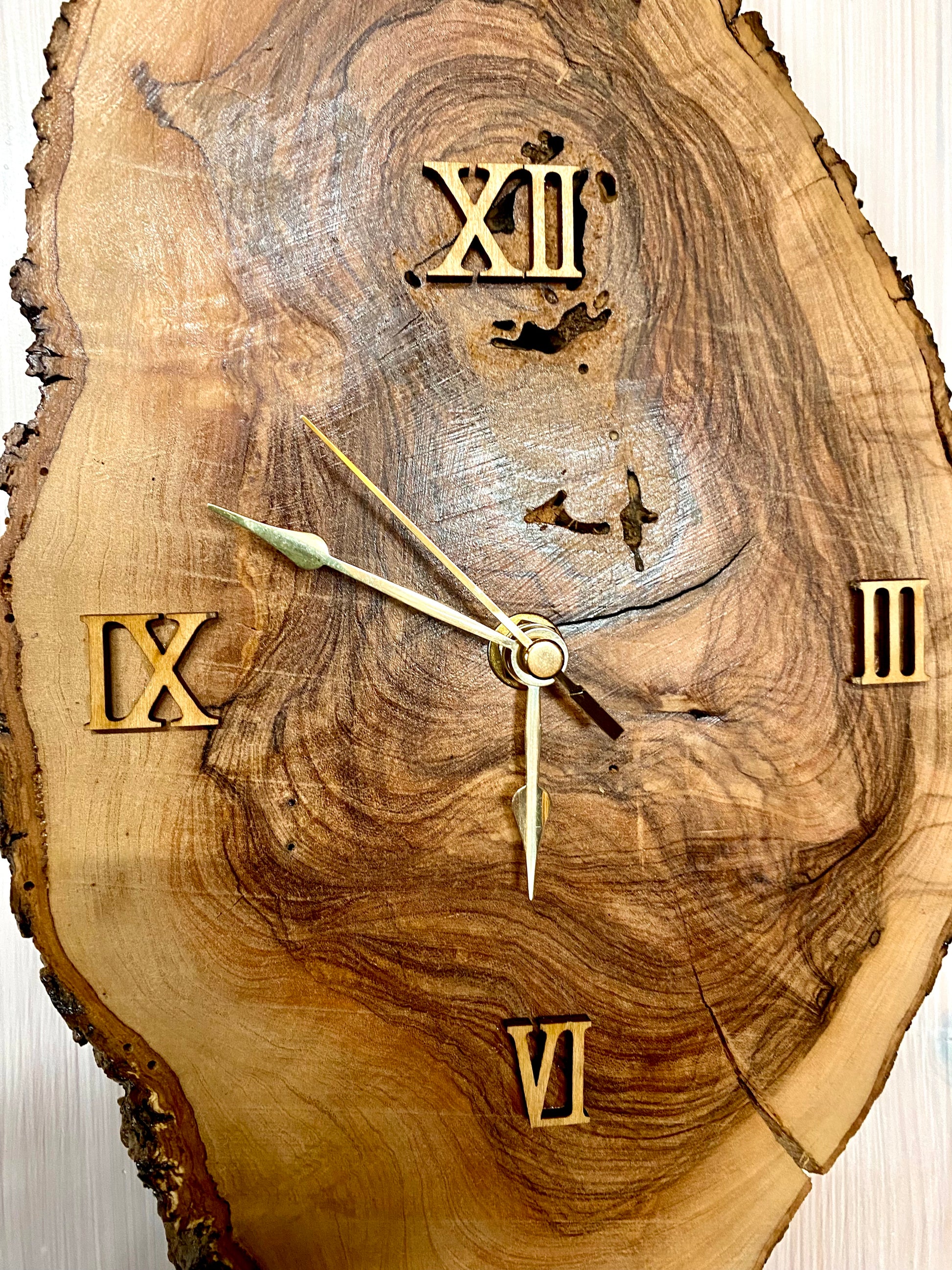 Splendido orologio artigianale in lEgeo di ulivo pugliese. Completamente realizzato a mano da fetta di tronco. Da parete, decorato con numeri romani in legno di abete. Meccanismo e lancette di qualità by Contini Firenze. Misure cm 19x31. Solo Made in Italy