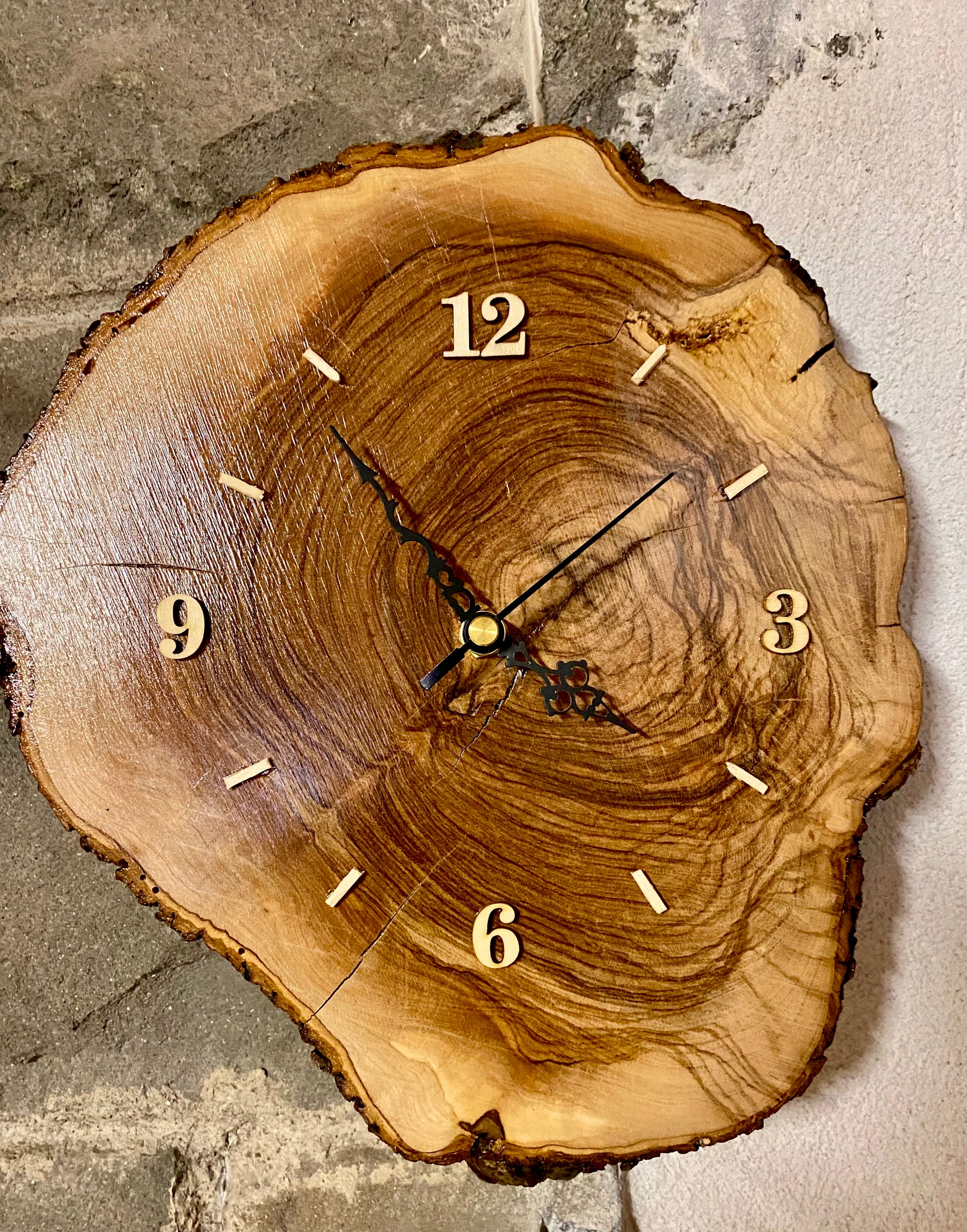 Splendido orologio artigianale in ulivo pugliese. Realizzato completamente a mano da fetta di tronco. Da parete, decorato con numeri arabi e tacche in legno di abete. Meccanismo e lancette di qualità by Contini Firenze. Misure cm 22x25. Solo Made in Italy