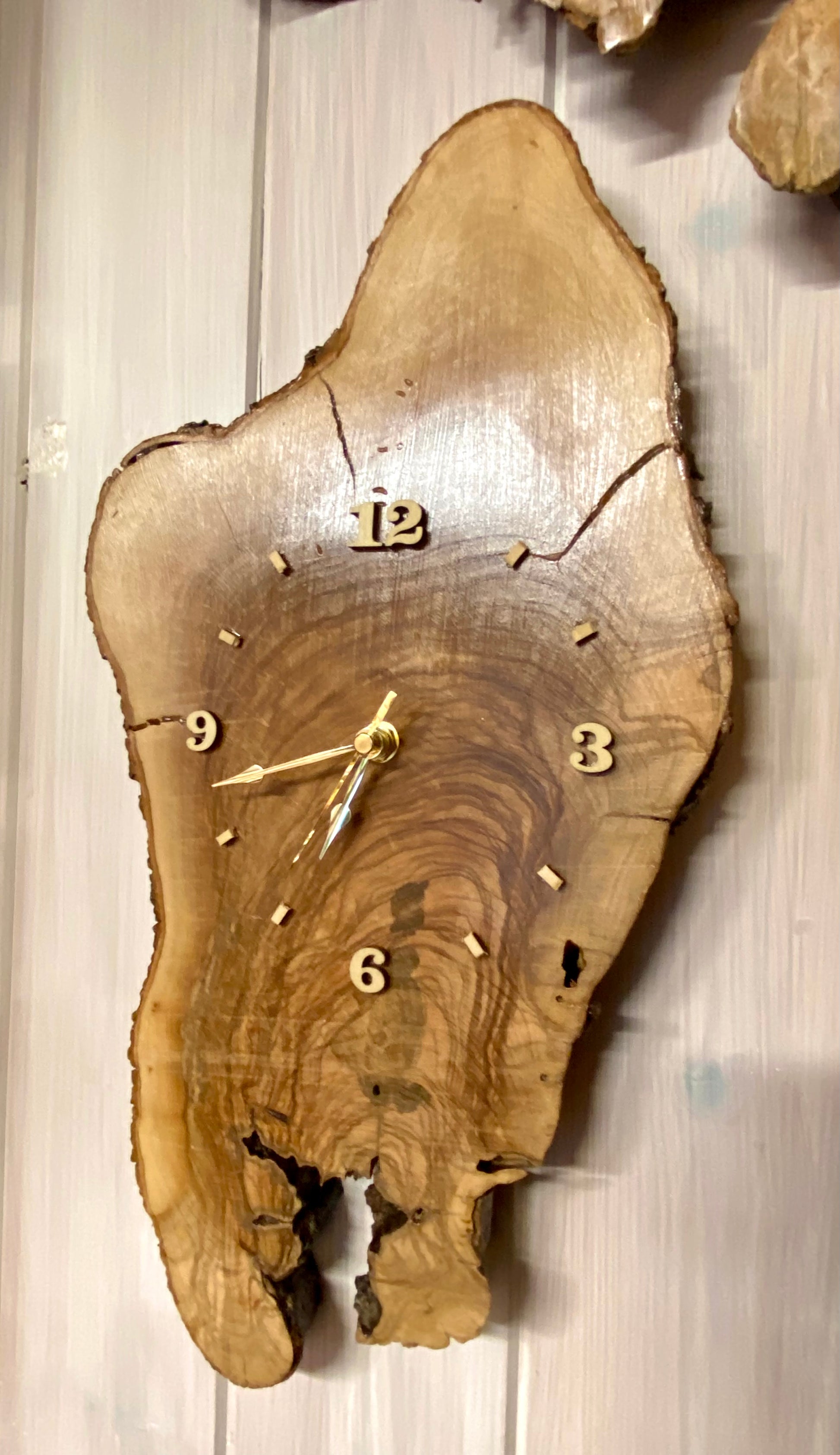 Splendido orologio da parete artigianale in legno di ulivo pugliese. Realizzato completamente a mano da fetta di tronco, decorato con nun’etichetta arabi e tacche in legno di abete. Meccanismo e lancette di qualità by Contini Firenze. Misure cm 23,5x43