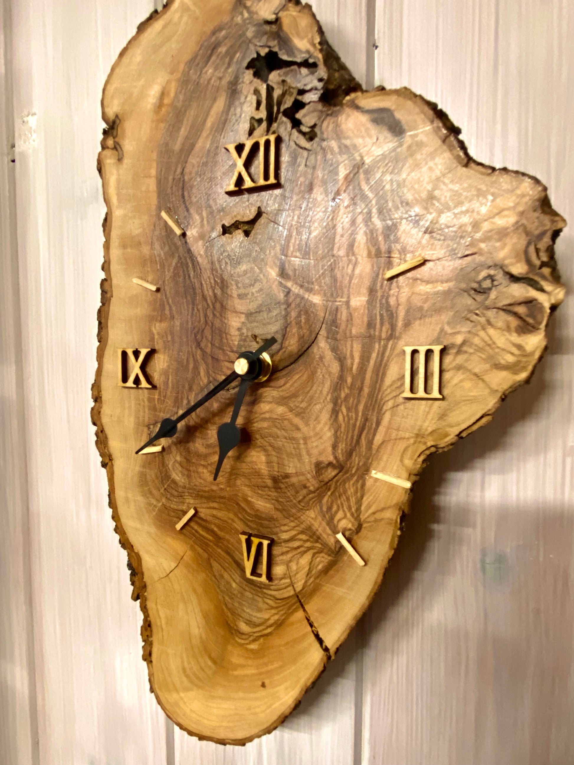Splendido orologio artigianale in ulivo pugliese. Realizzato completamente a mano da fetta di tronco, da parete. Decorato con numeri romani e tacche in legno di abete. Meccanismo e lancette di qualità by Contini Firenze. Misure cm 21x35. Solo Made in Italy